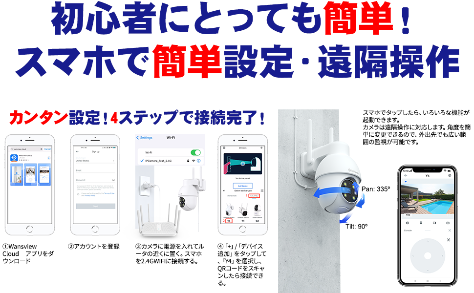 アプリダウンロード→登録→電源給電→スマホンでカメラをWIFIに接続、初心者でも簡単に設置設定できます。