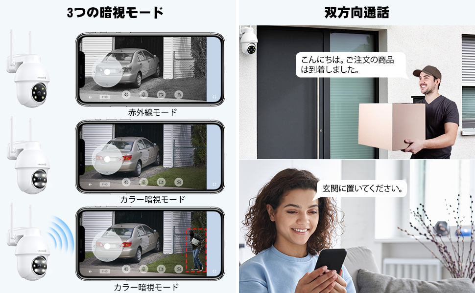 カメラは水平335°、垂直90°回転、広角撮影ができます。設置後、外出先でもスマホで操作できるため非常に便利!店舗や倉庫、駐車場の遠隔監視用カメラとしても大活躍!屋外カメラは動きを検知すると、メッセージを即座に送信します。重要なモーメントを見逃しません。