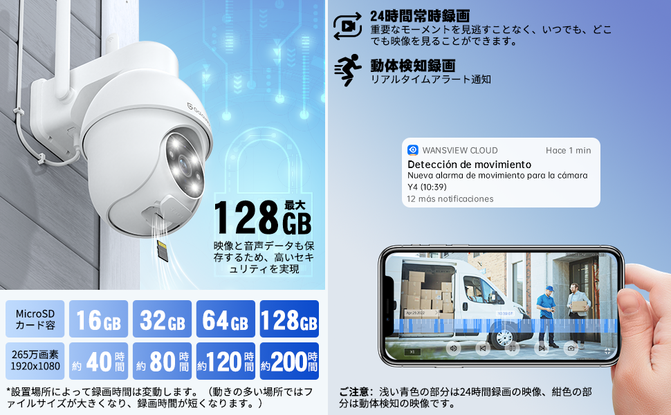 カメラはマイクロSDカード(別売)/クラウドストレージをサポートし、自動的に上書きできますので、長時間の録画でも心配ありません。